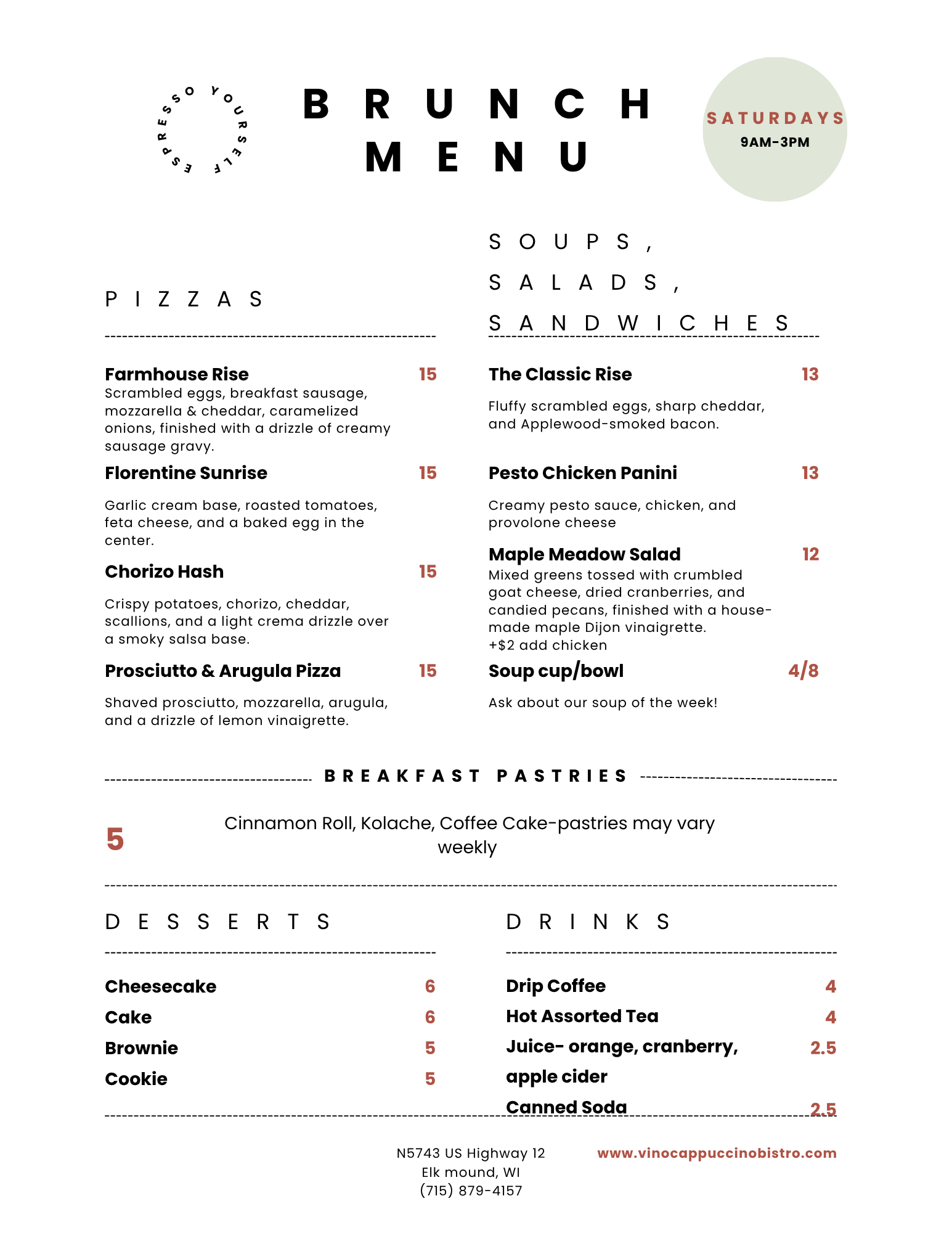 Brunch is offered on Saturdays from 9:00 am-3:00pm by reservation. Call, message us on social media, or fill our a contact form on our website to reserve your table!